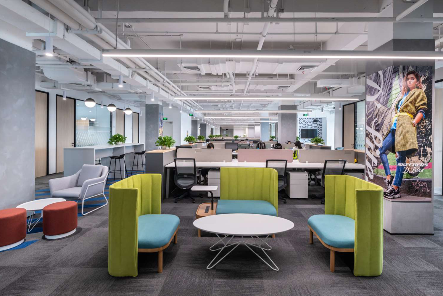 El diseño es el resultado de una combinación perfecta de formas y colores que representan la identidad de la empresa en su máxima expresión. La colección Silver Sea garantiza un color de fondo neutro y, gracias a su diseño de patrones fuertes, ayuda a crear una dinámica sin fin en el suelo. Para potenciar este efecto, se añaden acentos de color fuertes y, al jugar con los desplazamientos de las baldosas y la personalización de las formas, se muestran geometrías únicas en las diferentes áreas de la oficina.