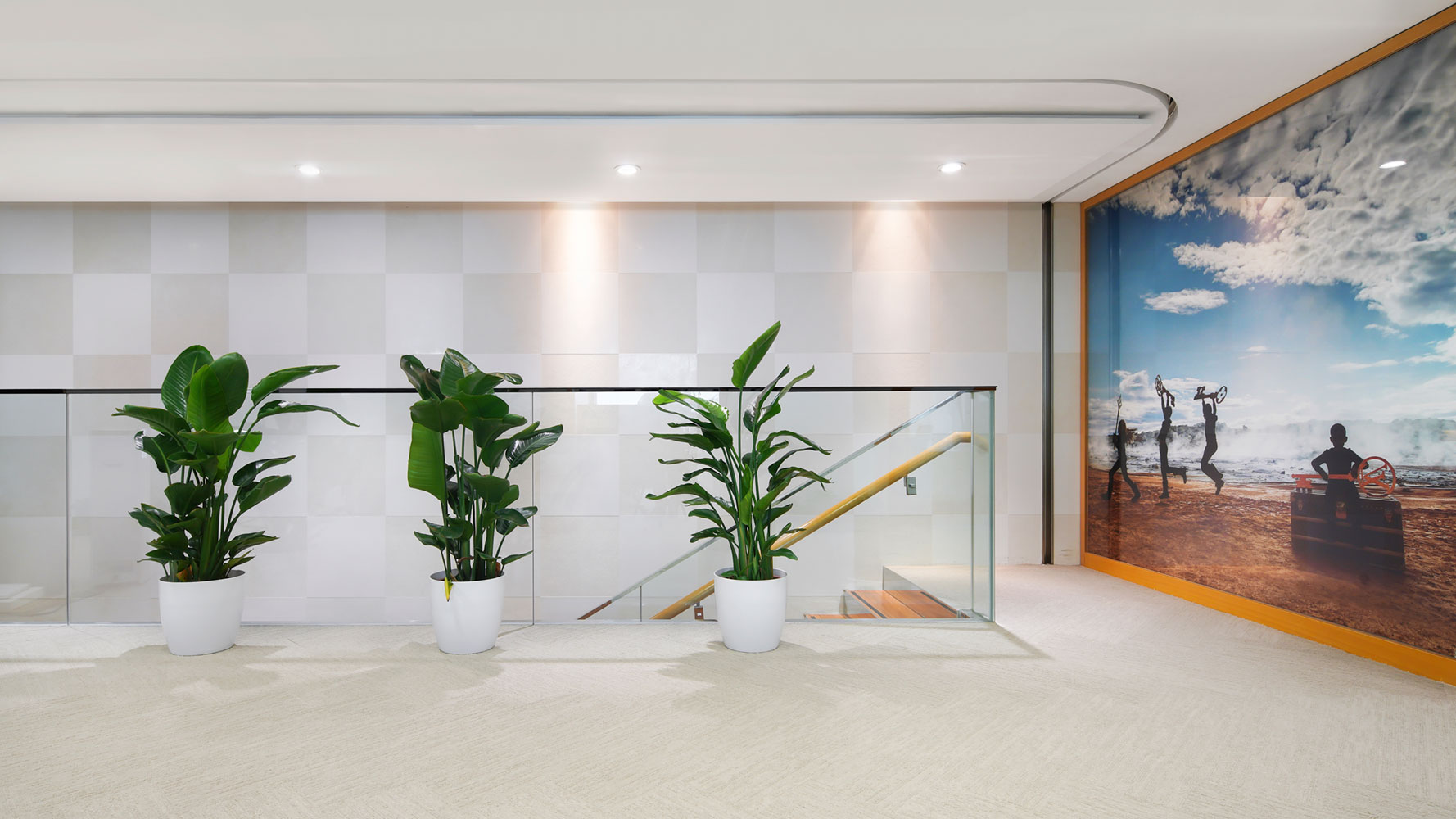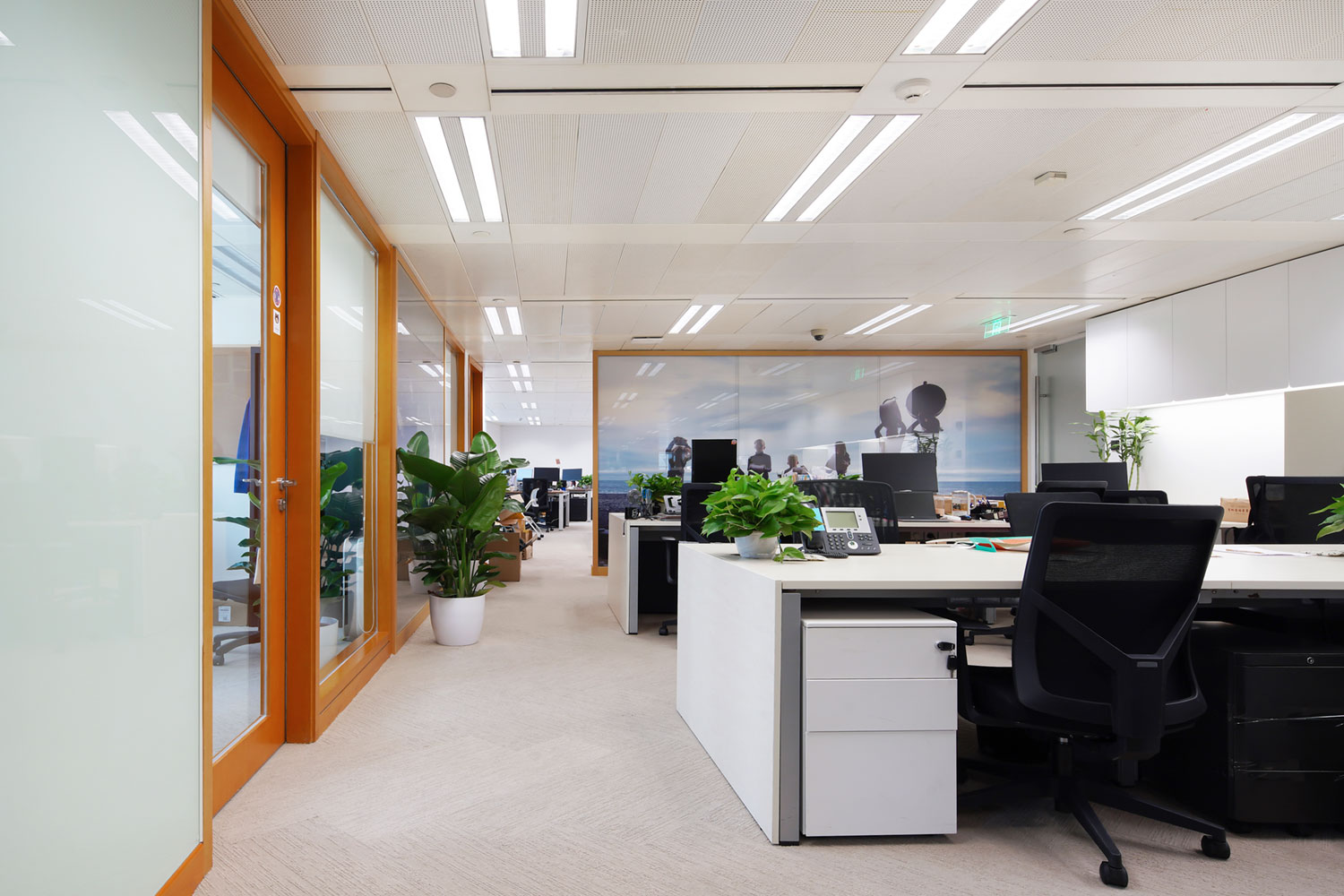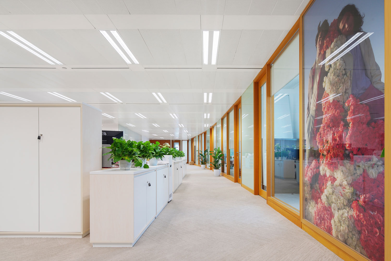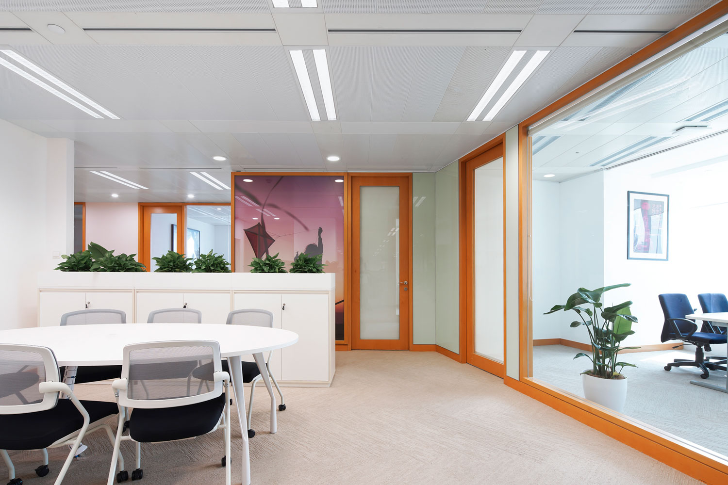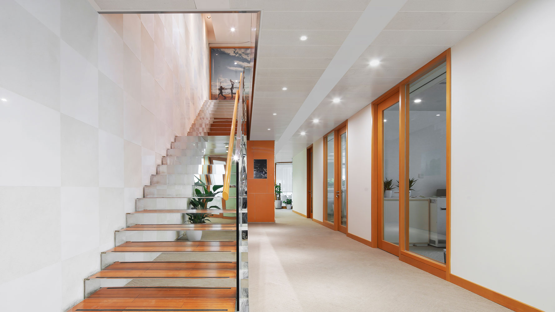 For such an elegant and refined fashion brand, VOXFLOR has developed an exclusive color tint for its Aarup product from Scandinavia Collection. A gentle and delicate tone of beige perfectly matches the strong orange accents of the interior design and lets the white furniture stand out from the background. Moreover, the product enriches with its refined pattern the different office areas providing from time to time different dynamics, thanks to its different displacement solutions.